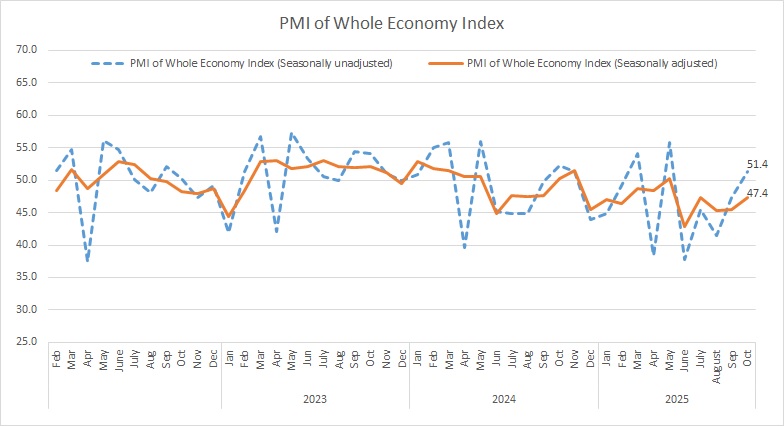 The seasonally adjusted headline PMI for the whole economy rose to 47.4 in Mehr, up from 45.5 in the previous month. The increase indicates that although the downturn persisted, the rate of decline slowed compared with Shahrivar (August 23 – September 22).